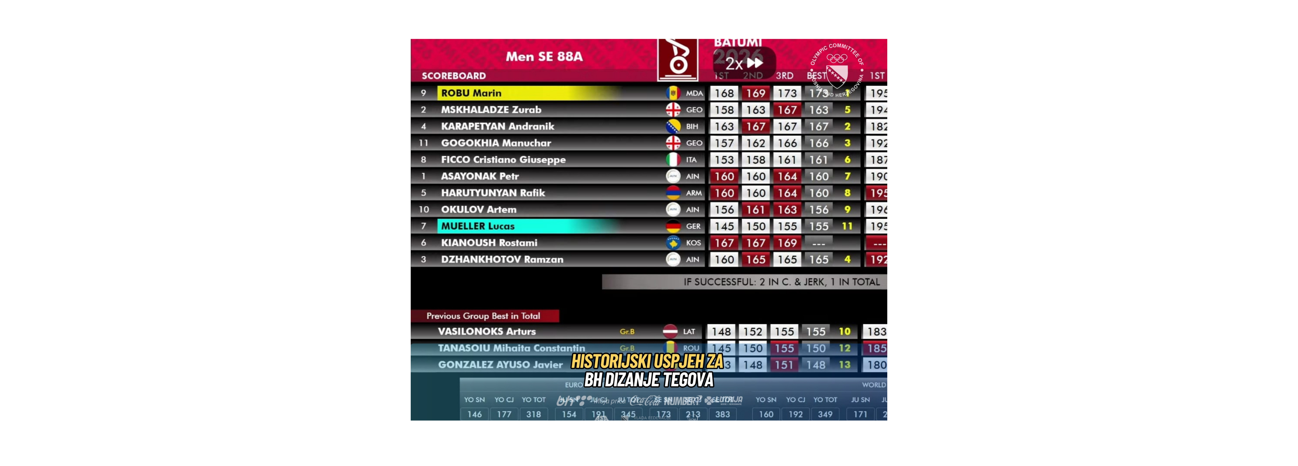 Naš olimpijac Andranik Karapetyan osvojio je srebrenu medalju u trzaju na Europskom seniorskom prvenstvu 2026. u Batumiju, Gruzija — prva ikad evropska medalja za Bosnu i Hercegovinu u dizanju tegova!