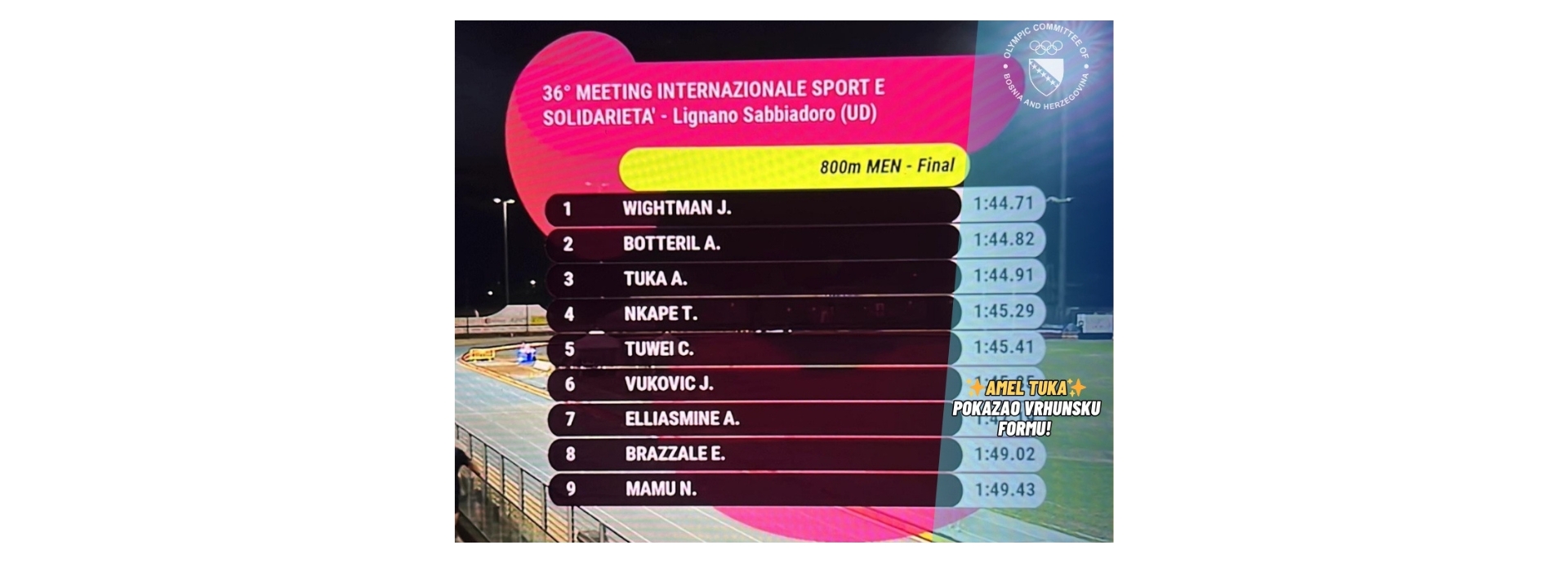 At the athletics meeting in Lignano, our best athlete and Olympian Amel Tuka ran the 800 meters in 1:44.91 – his best result of the season!